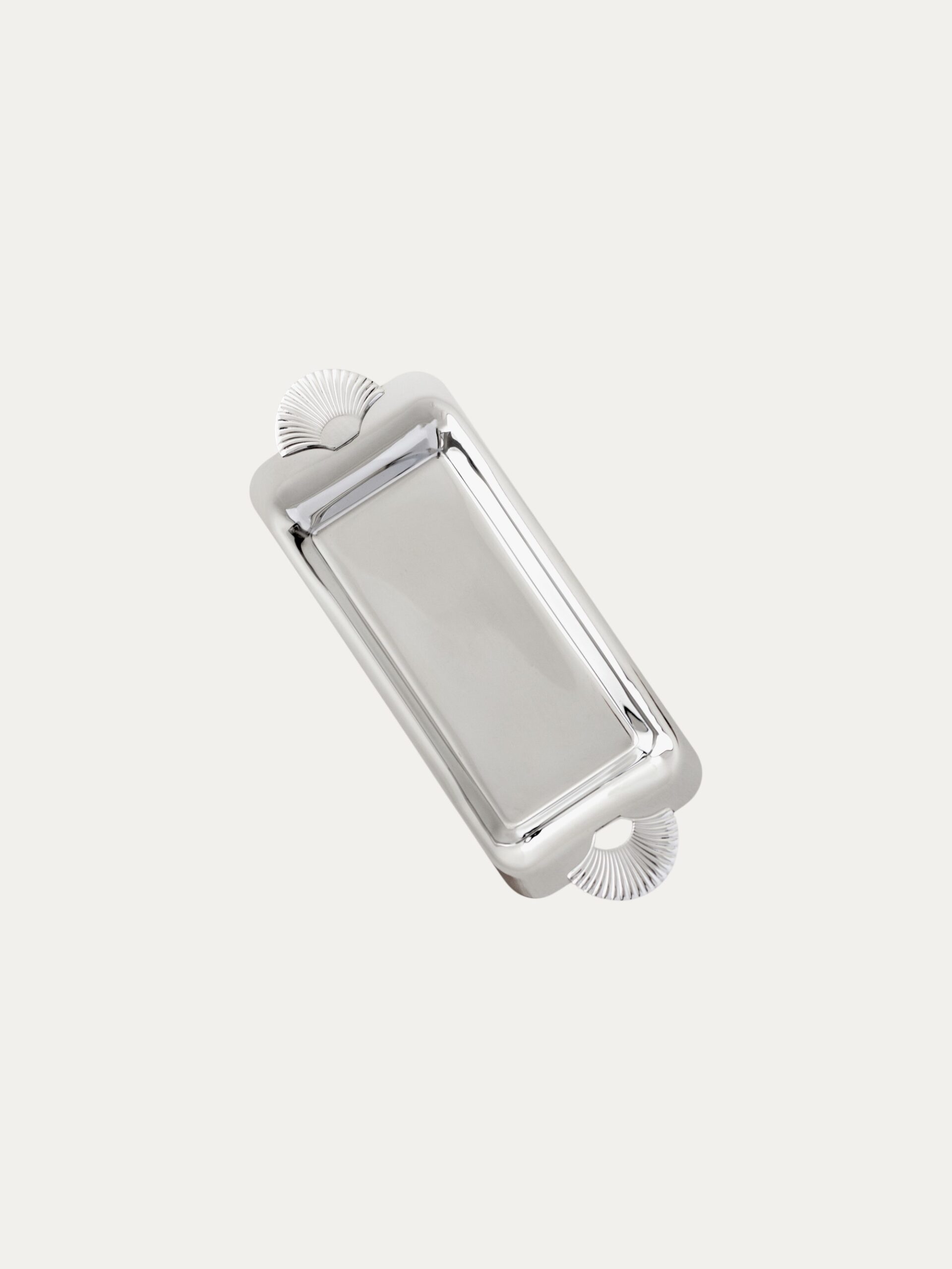 – Oblong silhouette with sculpted, shell-inspired handles.