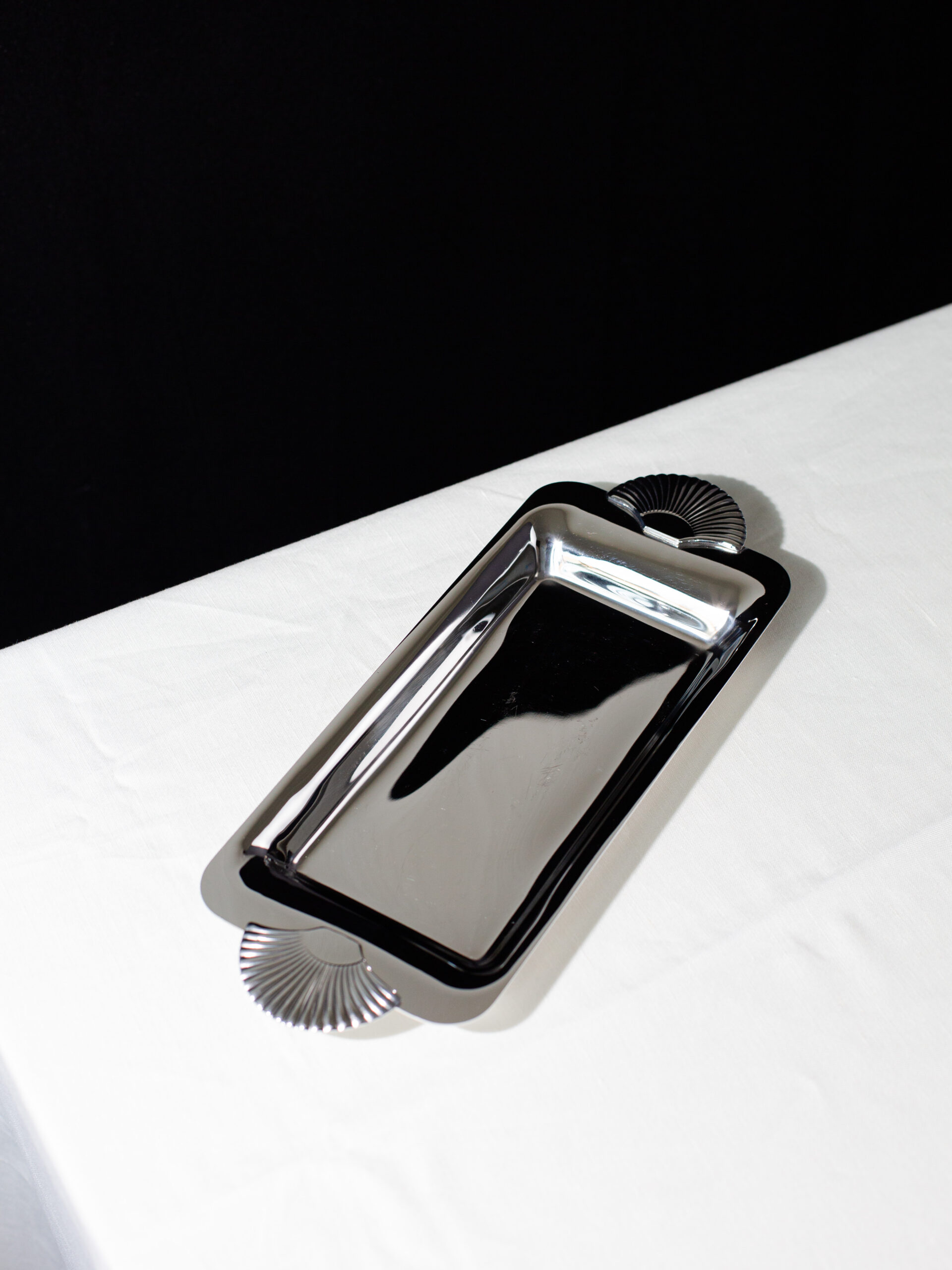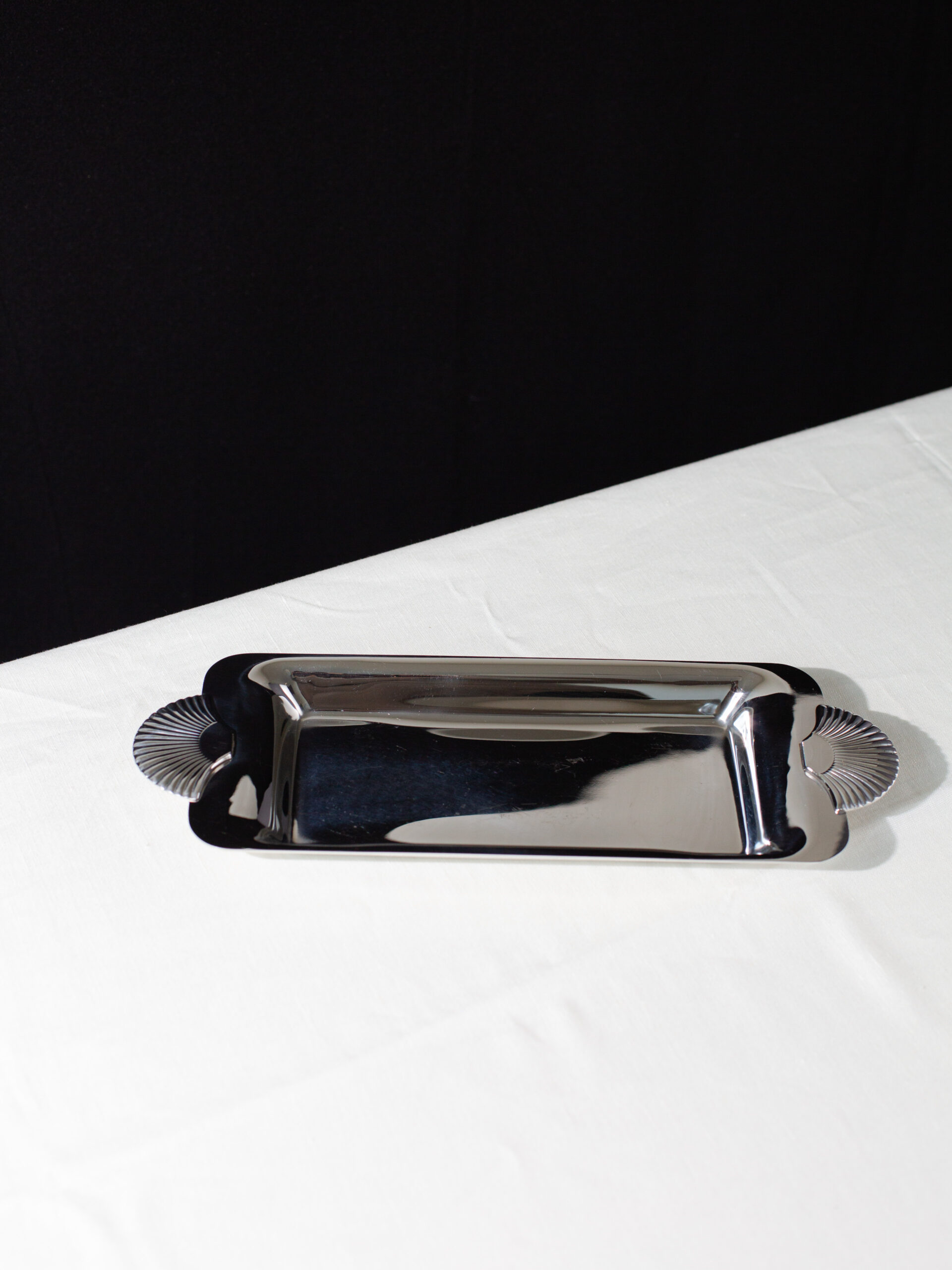 – Mirror-polished curves designed for both serving and display.